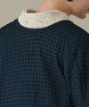 深みのある色合いと光沢感が美しいモール糸をドット状に編みこんだカシュクールカーディガンです。ベースの素材は、ウールとレーヨンの混紡糸にストレッチナイロンを撚糸した糸を使用し、柔らかくサラッとした肌触りが心地よく秋から春まで長くお召しいただけます。